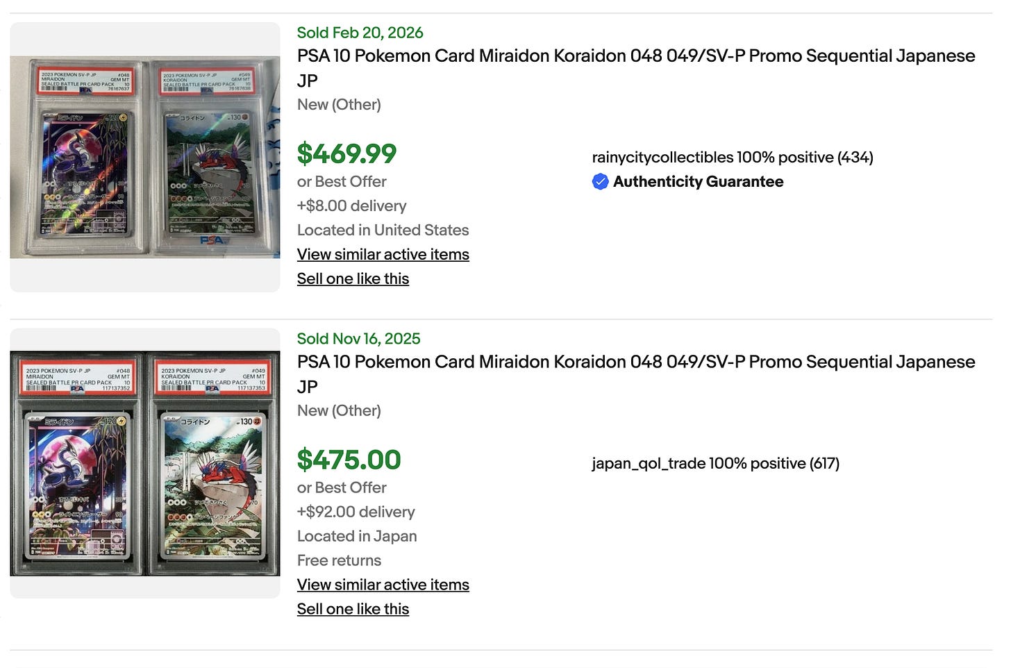 Collectors who chase these promos almost always want the complete pair from the same event, and they’re typically willing to pay a noticeable premium for it. As the image below shows, the last two matched pairs sold for approximately $470 — delivering an instant unrealized return of roughly 74%.