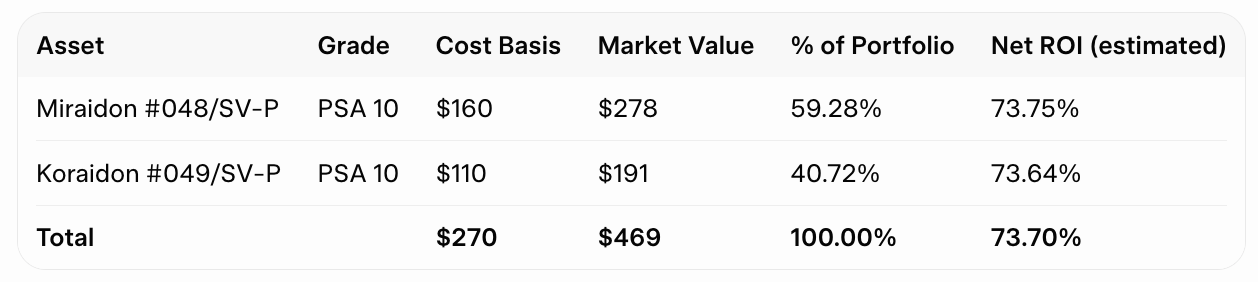 This portion of the portfolio focuses exclusively on Japanese promotional cards — a high-value and strategically important niche within the broader Pokémon TCG ecosystem. While I’m still in the early stages here, the long-term target is for this category to make up 10–20% of the overall portfolio.